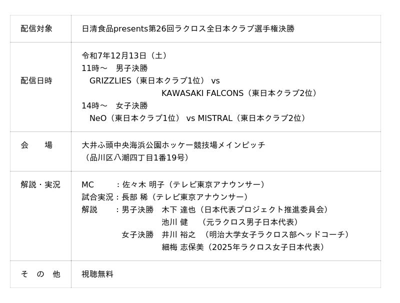 公益社団法人日本ラクロス協会協力のもとライブ中継配信を行う『ラクロス全日本クラブ選手権大会』は、全国の社会人クラブチームによるトーナメント大会であり、大井ホッケー競技場で行われる男子・女子決勝の2試合を中継いたします。最高峰の試合を、ラクロスに初めて触れる人にもわかりやすく実況・ルール解説等を交えながらお届けします。また、会場の魅力や試合の見どころ、注目選手など観戦を楽しむための情報も配信します。