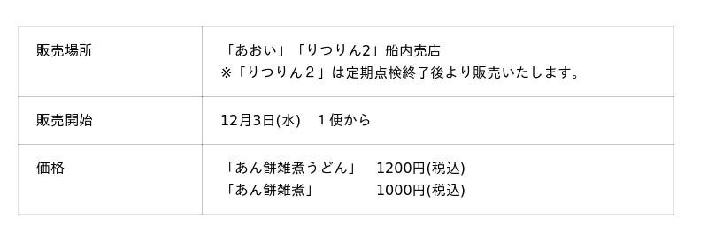 神戸~小豆島~高松を結ぶフェリーを運航するジャンボフェリー株式会社(本社:神戸市中央区、代表:山神正義)は、12月3日より季節限定メニューとして、香川県の代表的な郷土料理「あん餅雑煮」をさぬきうどんと組み合わせた新メニュー「あん餅雑煮うどん」を販売いたします。