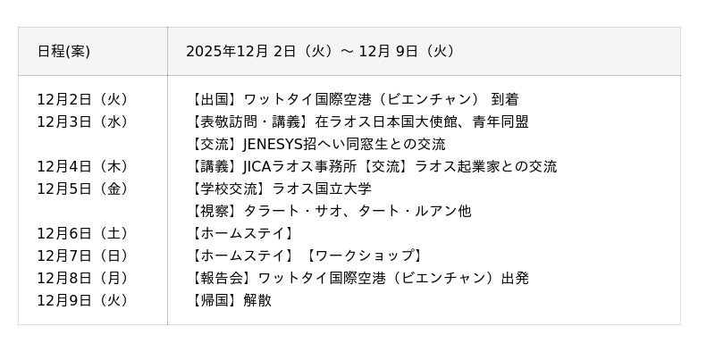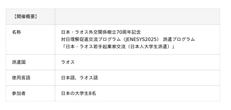 日本の大学生8名が、「若手起業家交流」をテーマにラオス・ビエンチャンを訪問します。現地では、JICAラオス事務所を訪問し、JICA事業の概要や、ラオスでのスタートアップ支援について学びます。また、同国の起業家との意見交換では、起業というアプローチを通じた協働を見据えて交流します。さらに、現地大学との交流やホームステイを通してラオスの文化や社会を体感し、日本の魅力を発信します。これらの活動を通じて、両国の相互理解と友好関係の一層の強化を目指します。