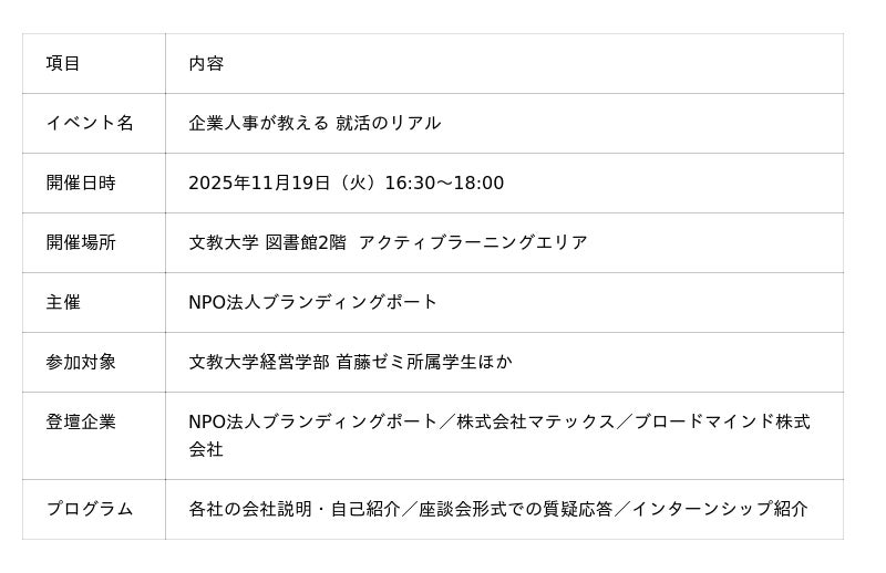 本セミナーは、NPO法人ブランディングポートの主催により、実際に採用を担当する企業の人事担当者が「就活のリアル」を本音で語り、学生の不安解消と早期からのキャリア意識醸成を目的として開催されました。文教大学経営学部の首藤ゼミに所属する学生を中心に、1・2年生も含めた幅広い学年の学生が参加しました。