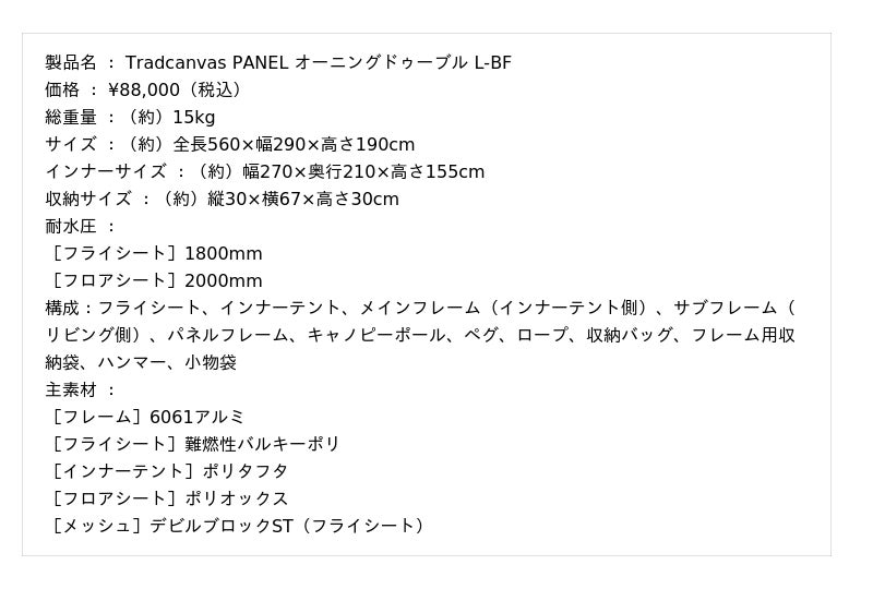 新型PANEL SYSTEM搭載で居住性と耐風性が向上した2ルームテント「Tradcanvas PANEL オーニングドゥーブル L-BF」をアウトドアシーンでぜひご活用ください。