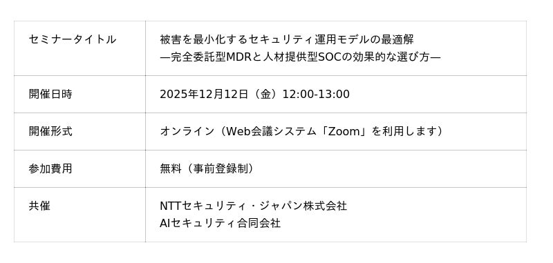 NTTセキュリティ・ジャパン株式会社(本社:東京都千代田区、代表取締役社長:関根 太郎)は、2025年12月12日(金)にAIセキュリティ合同会社(本社:東京都新宿区、代表取締役:堀居 隆生)と、「被害を最小化するセキュリティ運用モデルの最適解 -完全委託型MDRと人材提供型SOCの効果的な選び方-」セミナーを共同開催します。