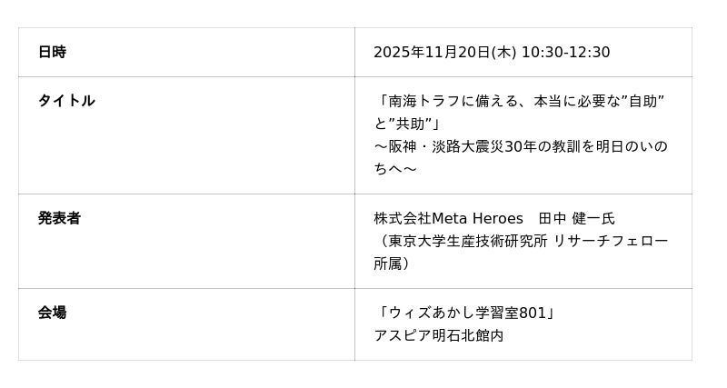 株式会社Meta Heroes(本社所在地:大阪府大阪市、代表取締役:松石和俊、以下「当社」)は、当社の田中健一氏が2025年11月20日(木)に開催された「明石市肢体不自由児父母の会 講演会」に登壇し、「南海トラフに備える、本当に必要な”自助”と”共助”」をテーマに講演を行ったことをご報告します。