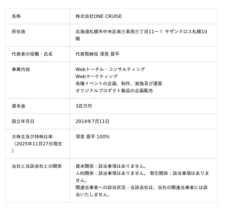 Webマーケティングとクラウドセールステック事業を展開する株式会社ジオコード(本社:東京都新宿区、代表取締役:原口 大輔、証券コード:7357)は、2025年11月27日開催の取締役会において、株式会社ONE CRUISE(本社:札幌市中央区、代表取締役:深見 晋平、以下「ONE CRUISE」という。)との間で、業務提携契約を締結することを決議し、同日付で締結いたしました。