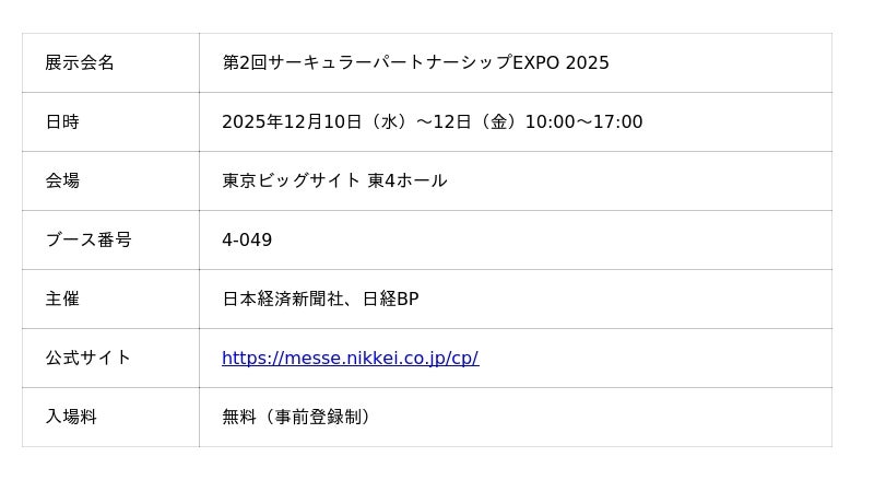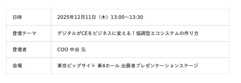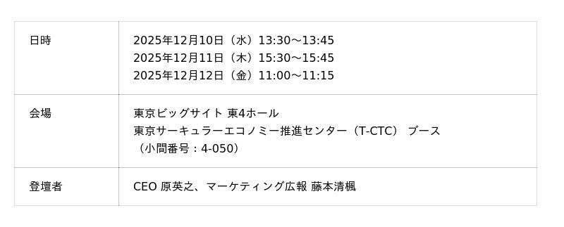 2025年12月10日(水)~12日(金)に東京ビックサイトにて開催される、「サーキュラーパートナーシップEXPO 2025」に出展いたします。