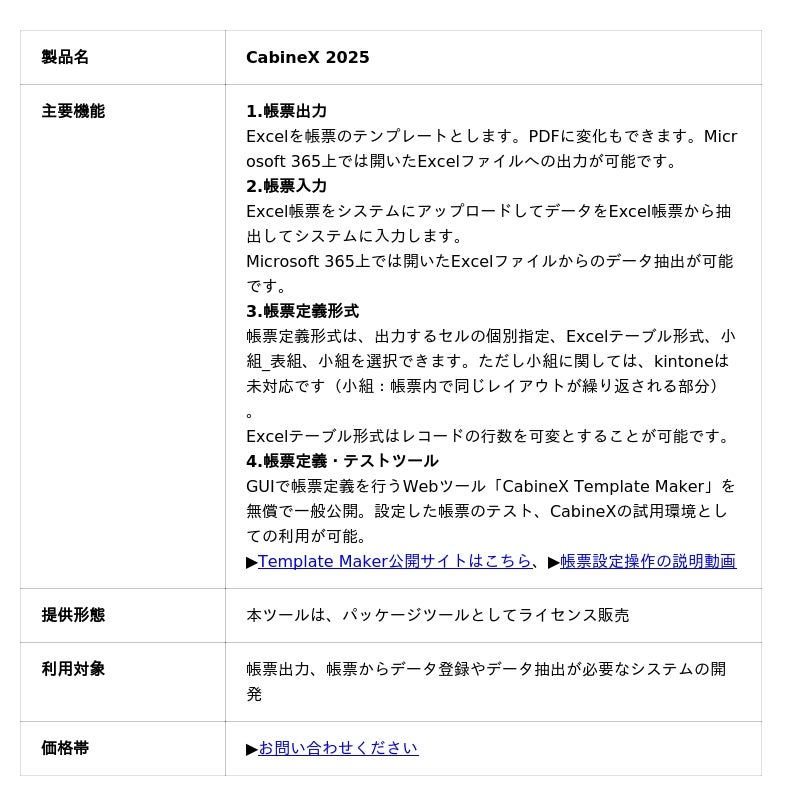 - ローコード・ノーコードアプリ構築ツールへの対応Microsoft 365のPower Automate/App対応kintone対応。- Excel テーブル形式への対応表形式の出力でレコード数は可変にすることが可能です。- 動的帳票入出(Excel Online対応)Microsoft 365版のみ対応です。従来、Excelへのデータ出力はファイル操作のため、開いたファイルへデータ操作ができませんでした。Excel Onlineに対応したことによって開いた状態でExcelファイルにデータの入出力が可能となりました。- CabineX Template Maker Web版を一般に無償公開帳票設定ツール「Template Maker」をWeb化して一般に無償公開しました。ユーザ側の管理者が帳票の変更や追加がさらに簡単に出来るようになりました。このサイトでは、設定した帳票に正しくデータを入出力できるかテストを行うこともできます。また、広く一般に公開していますので、CabineXの試用環境としても利用いただけます。(▶