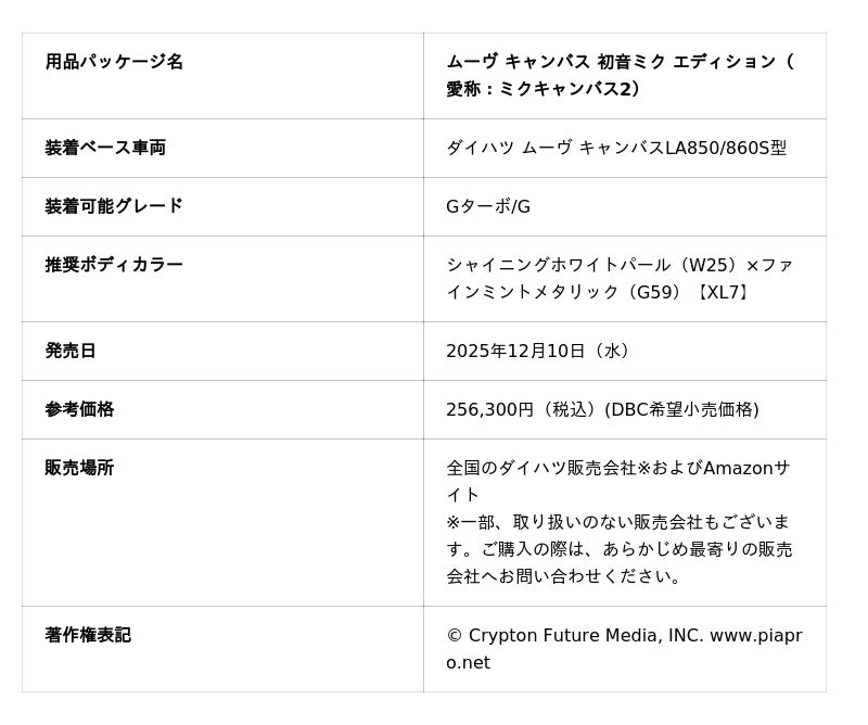 株式会社ダイハツビジネスサポートセンター(以下、DBC/本社:大阪府池田市/代表取締役社長:枝元俊典/ダイハツ工業株式会社100%子会社)は、バーチャル・シンガー「初音ミク」とタイアップした、ダイハツ車「ムーヴ キャンバス」専用用品パッケージである「ムーヴ キャンバス 初音ミク エディション(愛称:ミクキャンバス2)」を、2025年12月10日(水)に発売します。