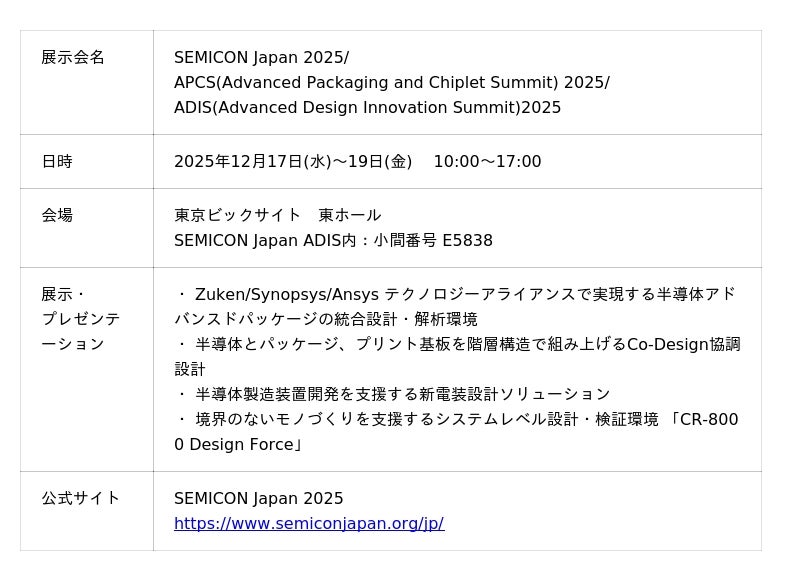 株式会社図研(本社:神奈川県横浜市、代表取締役社長:勝部迅也)は、2025年12月17日(水)~19日(金)に開催される「SEMICON Japan 2025」に出展します。