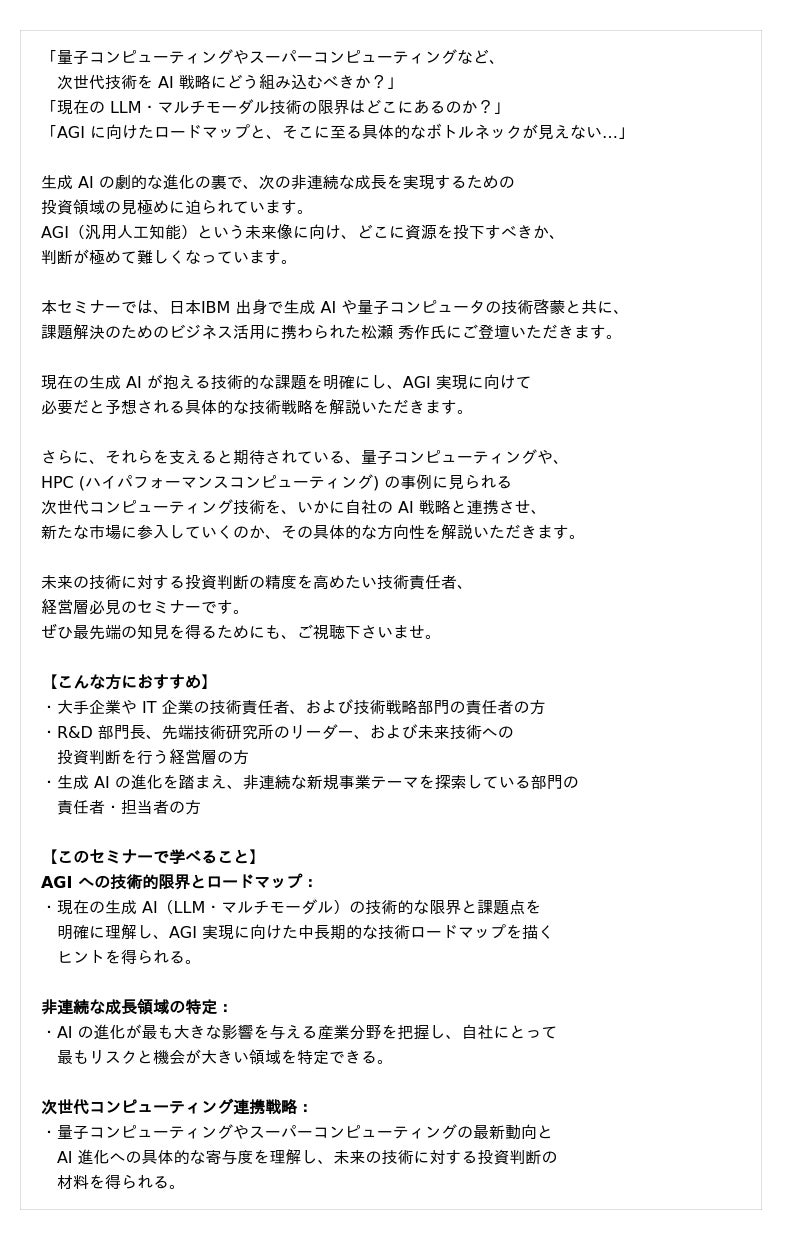【 12/17 (水) 16:00 】元 IBM 研究者が語る AGI を見据えた技術的ブレイクスルーとロードマップ 無料オンラインセミナーを開催