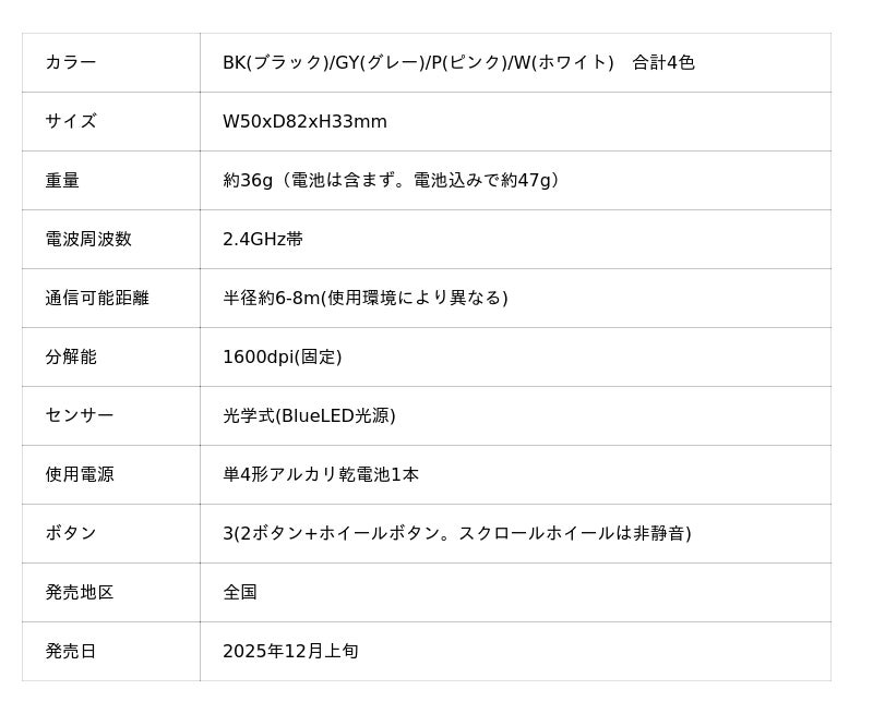 - ふわり軽やか、わずか47gの小型軽量無線マウス- 静音ボタン仕様で外出先でも大活躍- Bluetooth通信とレシーバー通信2種類の無線通信。Bluetooth通信は3台の機器を切り替えられるマルチペアリング仕様- 落ち着いた色味の4色展開