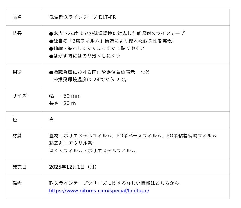 株式会社ニトムズ(本社:東京都品川区、代表取締役社長:右近敦嗣)は、氷点下24度までの低温環境下にも対応できる「低温耐久ラインテープ DLT-FR」を2025年12月1日(月)に発売しました。