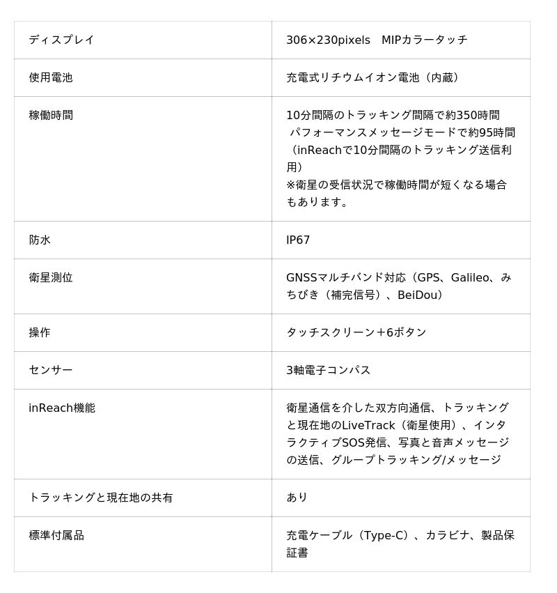 - 携帯電波の届かない環境で安全・安心をサポートする衛星通信コミュニケーターコンパクトで軽量な衛星通信コミュニケーター。約70基の衛星で全世界をカバーするイリジウムネットワークを経由して、双方向でメッセージの通信を行うことが可能。また緊急時には、24時間365日対応可能な「Garmin応答センター」に、世界のどこにいても位置情報とともにSOSメッセージを送ることができます※。SOSはボタン一つで発信可能。誤動作を防ぐ保護キャップ付きです。さらに、SOS要請のメッセージは世界中どこにいても日本語に対応。- 高解像度タッチカラースクリーン新搭載でダブルインターフェイスに★ディスプレイは306×230pixelsに拡大し、MIPカラータッチスクリーンに進化。6つのボタンに加え、タッチスクリーンによる直感操作が可能になり、操作性や視認性が向上。- 写真や音声メッセージの送受信が可能に。テキストメッセージは最大1,600バイト★簡単操作の専用アプリ「Garmin Messenger App」を使用して、写真や音声メッセージの送信が可能になりました。音声メッセージは最大30秒間。さらに、テキストメッセージはこれまでの160バイトから大幅に増強。最大1,600バイト(日本語の場合533文字)のロングメッセージを1つのテキストとして送信できます。また、マイク&スピーカー内蔵により、受信した音声メッセージをデバイスで再生可能になりました。- バッテリー性能がさらに向上、約350時間の稼働を実現★稼働時間は、10分間隔のトラッキングモードで約350時間を実現。長期のフィールドワークやトレイルでもバッテリーの心配をすることなく安心です。- コンパクト&タフネス設計荷物の負担にならないサイズ感と重量を実現。また、アメリカ国防総省が定める標準規格MIL-STD-810に準拠。耐熱、耐衝撃に加え、防水等級IP67の耐水をクリアした頑丈な設計。- マルチGNSSマルチバンドによる正確な位置情報提供。ナビゲーション機能と軌跡表示、デジタルコンパスも搭載携帯電波の届かない場所でも、マルチGNSSにより正確な位置情報を自動的にトラッキング。2周波数帯(L1信号・L5信号)を受信し、過酷な環境でも高精度で素早い位置情報を提供します。(受信環境や設定により稼働時間が異なります)アプリ「Garmin Explore App」とペアリングすれば、スマートフォンやタブレットで旅を計画したりデータを確認することができます。また、同じルートでスタート地点に戻れるようにナビゲートする「TracBack機能」を搭載。ルートを外れた場合にも迷わず戻れるようサポートします。デジタルコンパス内蔵で、移動中/静止中を問わず正確な方位情報を提供します。- Garminデバイスとのペアリングでスマホ通知機能のように使用も可能Garminのウェアラブルデバイスとペアリングすることで、inReachで受信したメッセージをウェアラブルデバイスで確認することが可能。- 2つのアプリで、幅広く効率的な活用が可能に双方向メッセージ、グループメッセージ、24時間対応のGarmin応答センターとのSOSの双方向メッセージなどが可能な「Garmin Messenger App」は、Wi-Fi、携帯電話ネットワーク、衛星ネットワーク接続を自動切替することでシームレスな接続を実現し、かつ衛星通信量を抑えます。また、「Garmin Explore App」を活用すれば、アプリの地図を使ったナビゲーションや、ルート作成・ポイント管理などができます。- 天気情報位置情報をもとに、衛星通信を介して週間予報を含む天気情報を取得します。天気情報は本体のディスプレイで確認が可能です。- シンプルで使いやすい衛星通信サブスクリプションGarminの衛星通信サブスクリプションは、手頃な価格と柔軟性を備えたプランが特徴。月単位からの契約が可能で、目的に合わせて利用できる4プラン(個人プラン)を提供。- 自分の位置情報の共有圏外エリアであっても衛星通信を使い、10分間隔(デフォルト)でデバイスの位置情報を発信し、家族や友人に自分の居場所や安全を伝えることが可能。リアルタイムに共有するため、グループ登山やフィールド調査時にはぐれた際の位置情報確認にも役立ちます。