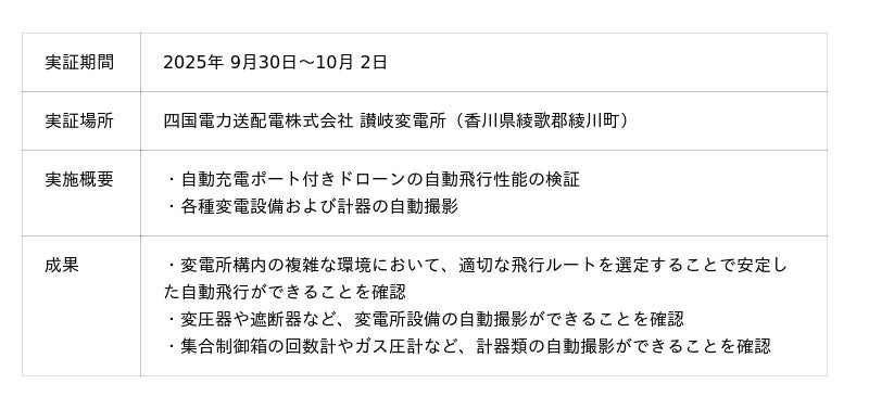 KDDI スマートドローンは、四国電力送配電株式会社(以下、四国電力送配電)が設備管理する、四国最大級の変電所である讃岐変電所において、Skydio, Inc.(以下、Skydio)の自動充電ポート付きドローン「Skydio Dock for X10」を活用し、変電所設備の自動巡視点検を実証(以下、本実証)しました。