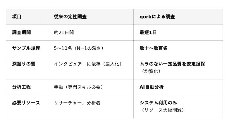 また、定量調査は数百名規模で実施できますが、表面的な回答に留まり、深い顧客理解には課題がありました。