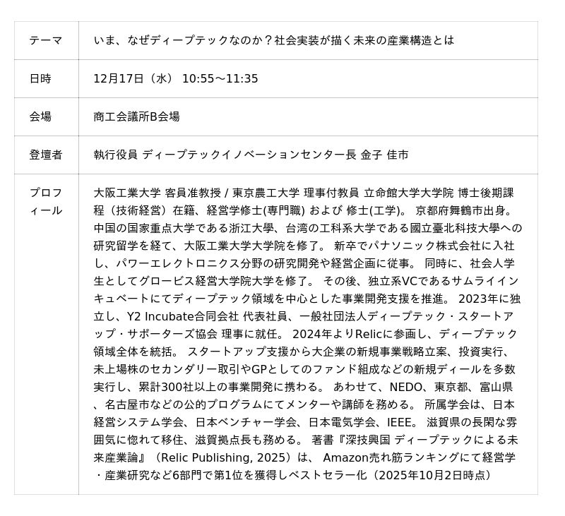 - イベント名称:Startup JAPAN 2025 in 大阪- 開催日時:2025年12月17日(水)・18日(木)10:00~17:00 予定- 会場:マイドームおおさか、ほか複数施設- 来場者数:1万2000名(予定)- イベント特設サイト: