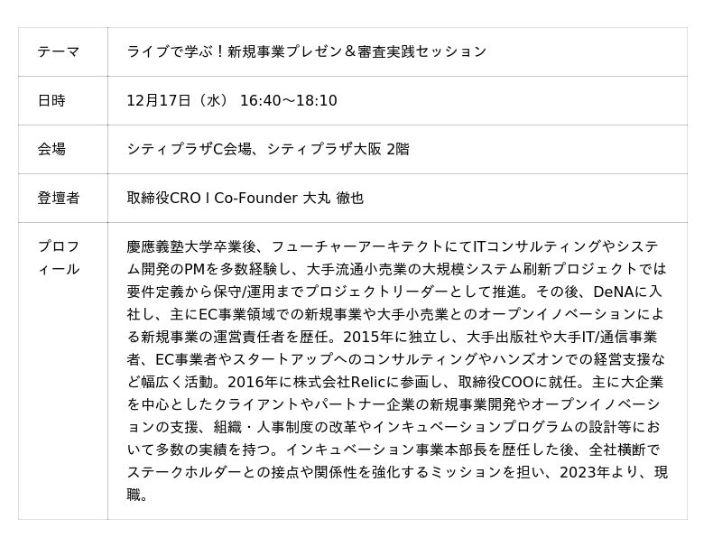 事業共創カンパニーである株式会社Relic(本社:東京都渋谷区、代表取締役CEO:北嶋貴朗、以下、Relic)は、2025年12月17日(水)・18日(木)の2日間にわたり、マイドームおおさかほか複数施設にて開催される日本最大級のスタートアップ展示会「Startup JAPAN EXPO 2025 in 大阪」(併催:新規事業 大会議 2025 in 大阪)へ取締役CROの大丸徹也を含む役員・マネージャー計5名が登壇することをお知らせします。