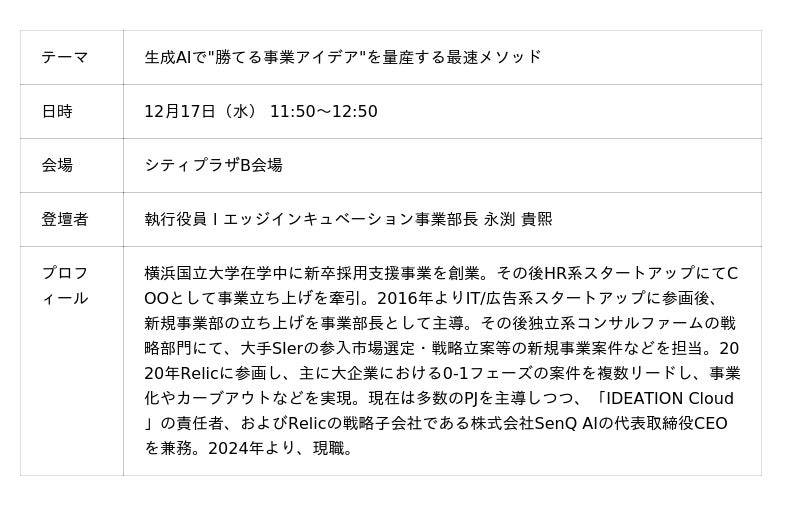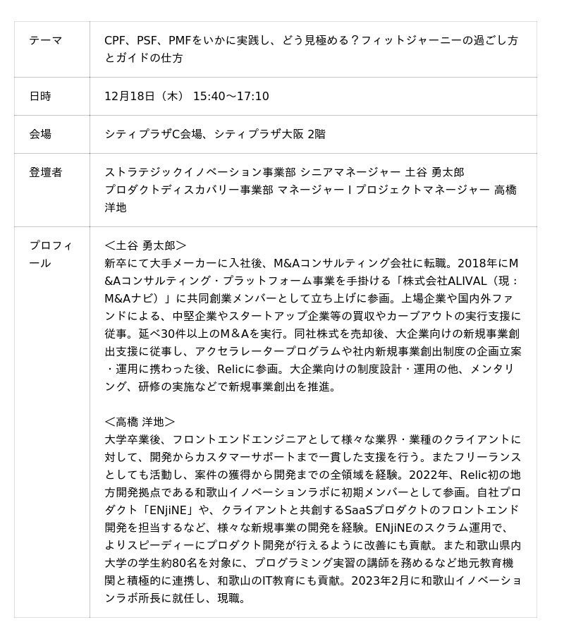 Relicは、創業以来一貫して大企業からスタートアップまで多岐にわたる新規事業の創出・推進を支援してまいりました。本イベントの各セッションでは、ディープテック、生成AI活用、PMF(Product Market Fit)実践、そして新規事業プレゼンの審査員が持つ評価視点といった、新規事業を取り巻く最先端のテーマについて、実践的な知見を提供します。
