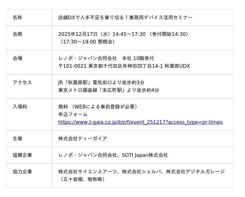 株式会社ティーガイア(本社:東京都渋谷区、代表取締役社長:石田 將人、以下、当社)は、2025年12月17日(水)にレノボ・ジャパン合同会社本社(東京都千代田区)にて、飲食・小売業界向けにオフラインイベント「店舗DXで人手不足を乗り切る!業務用デバイス活用セミナー」を開催します。
