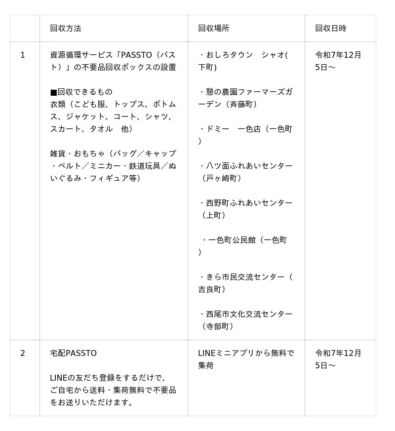 本協定により、令和7年12月5日より、ECOMMITが運営する資源循環サービス「PASSTO(パスト)」の不要品回収ボックスを市内8拠点に設置し、ご家庭で不要になった衣類や雑貨を廃棄するのではなく、リユースやリサイクルへと繋げる仕組みを提供することで、地域全体で資源循環に取り組みます。