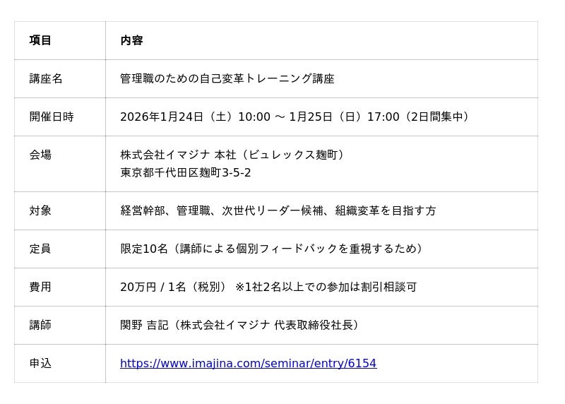企業ブランディングのコンサルティングを行う株式会社イマジナ(代表取締役社長:関野吉記、本社:東京都千代田区)および一般社団法人ブランドマーケティング協会は、2026年1月24日(土)・25日(日)の2日間、東京・麹町のイマジナ本社にて、経営幹部・管理職を対象とした「管理職のための自己変革トレーニング講座」を開催いたします。