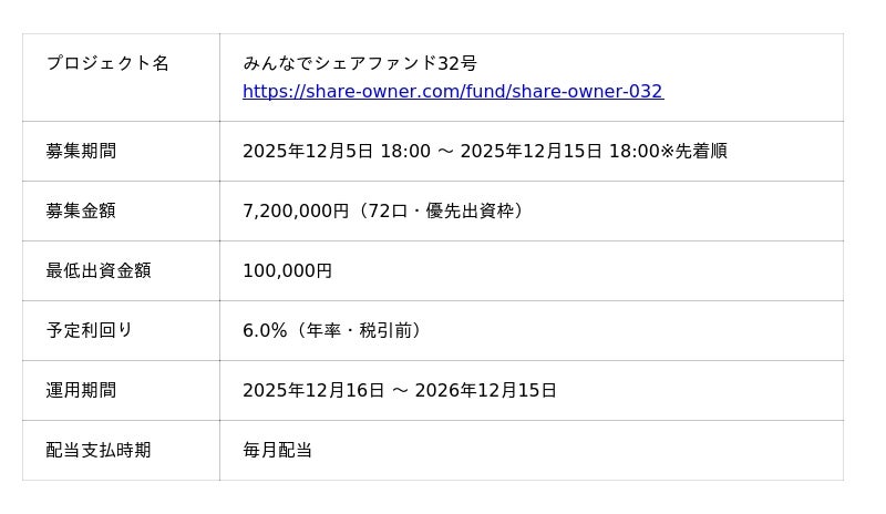 『みんなでシェアファンド』32号ファンド 2025年12月5日(金)18時より先着順にて募集開始
