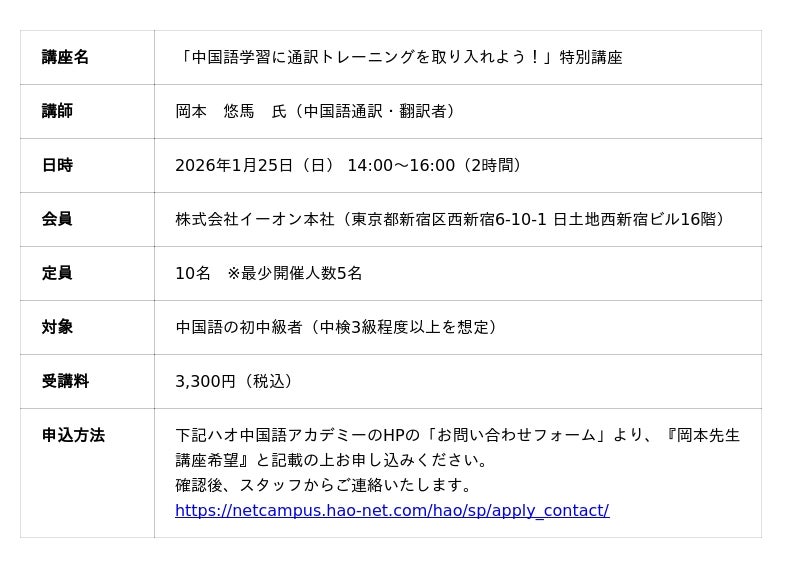 株式会社イーオン(本社:東京都新宿区、代表取締役社長:重野卓、以下「イーオン」)が運営するハオ中国語アカデミーは、2026年1月25日(日)に中国語特別講座「中国語学習に通訳トレーニングを取り入れよう!」を開催いたします。