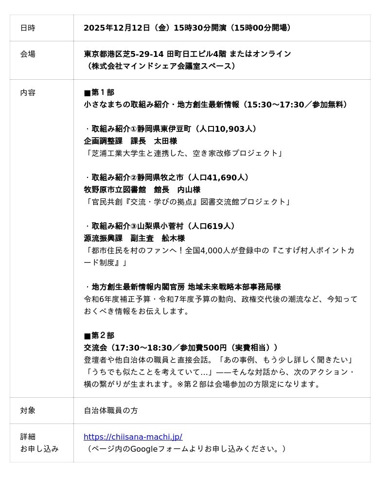 また、2025年12月12日(金)には、自治体職員を対象としたイベント「第1回小さなまちの未来フォーラム」を開催します。