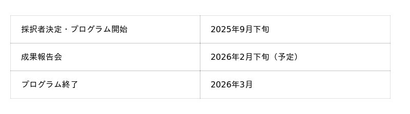 採択者は、今後、約6カ月間のメンタリングなどの個別支援を受け、2026年2月下旬(予定)の成果発表会にご参加いただきます。