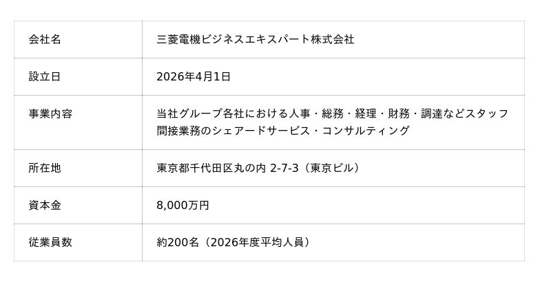 三菱電機株式会社は、各部門・拠点・グループ会社に分散する人事・総務・経理・財務・調達などの 領域における共通的な間接業務を集約し、ワンストップでグループ各社にサービスを提供する機能統合型シェアードサービス会社「三菱電機ビジネスエキスパート株式会社」を2026年4月1日付で設立します。同社を当社グループにおける間接業務改革の推進ドライバーとして位置づけ、DX・AI活用など業務改革への投資効果を最大化し、業務効率化とグループ全体の生産性向上による経営体質の強靭化を一丸となって推進していきます。