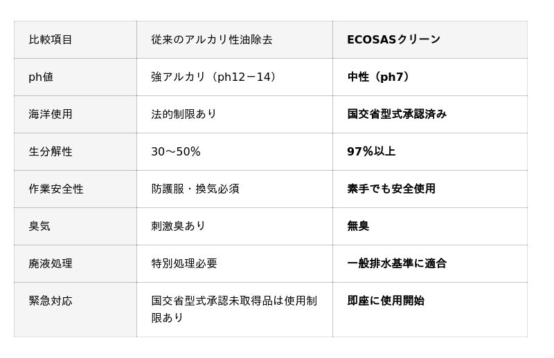 従来の強アルカリ性油除去剤では不可能だった「作業安全性・環境保護・洗浄効果」の三位一体を実現し、「危険で使えない洗浄剤から、安全で使いたい洗浄剤へ」のパラダイムシフトを起こしています。