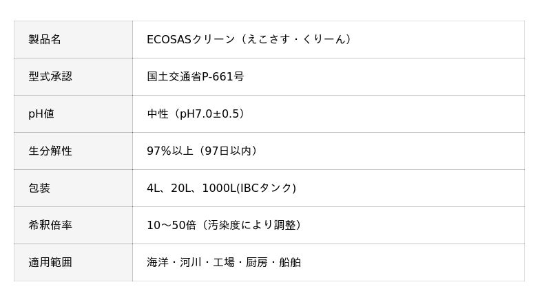 ASPiA JAPAN株式会社(本社:東京都台東区、代表取締役社長:笹原憲久)が開発する環境対応型油除去剤「ECOSASクリーン」が、国土交通省型式承認(P-661号)を取得し、「海洋散布可能な中性油除去剤」として正式認定されました。