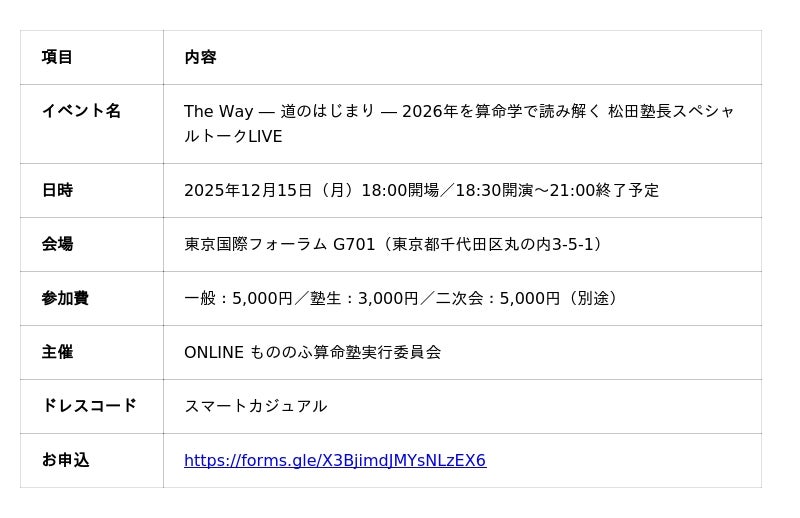もののふ立志会は、2025年12月15日(月)、東京国際フォーラムG701にて、スペシャルトークイベント「The Way ― 道のはじまり ― 2026年を算命学で読み解く 松田塾長スペシャルトークLIVE」を開催いたします。