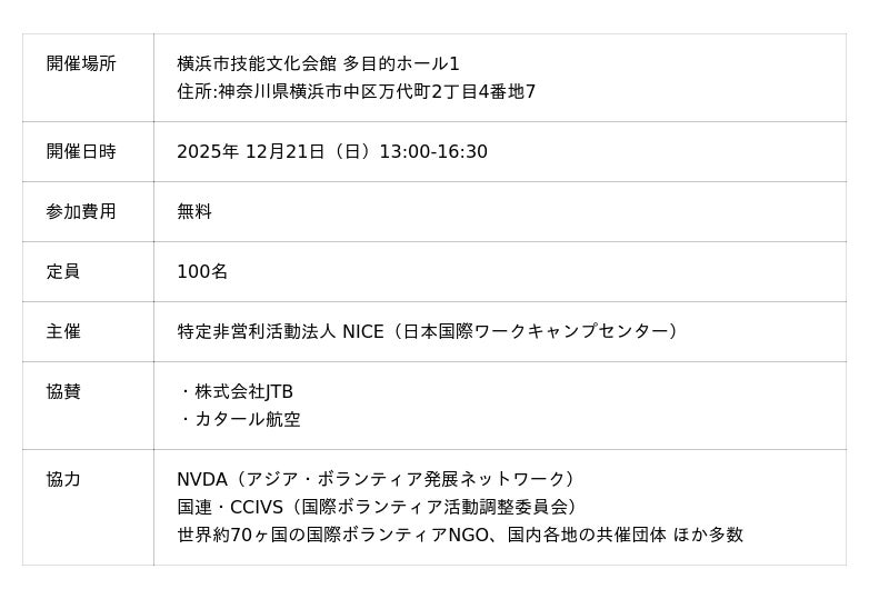 国際ボランティアNGO「NICE」、12月21日に“国際ボランティア大賞2025 全国大会決勝” を開催 - 地方大会4ヵ所から決勝に進んだ9名が集結、JTB連携の「notabi賞」授賞者も決定。