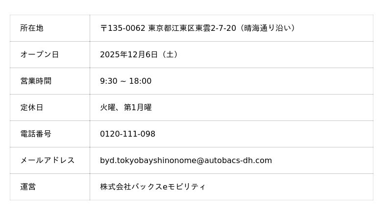 BYDの日本法人であるBYD Auto Japan株式会社(本社:神奈川県横浜市、代表取締役社長:東福寺 厚樹、略称:BAJ)の正規ディーラーである株式会社バックスeモビリティ(*1)(本社:東京都練馬区、代表取締役社長:三田 真之)は、2025年12月6日(土)に、全国で48店舗目となるショールームを備えた正規ディーラー店舗「BYD AUTO 東京ベイ東雲」をオープンします。また、12月6日(土)~7日(日)の期間にて、「ジャパンモビリティショー2025」で参考出品したBYDハイエンドEV「YANGWANG U9」の展示を行います。