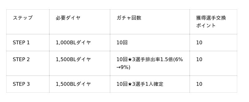 「<聖夜の軌跡>ステップアップ選手ガチャ」は無償BLダイヤでも挑戦いただけるステップアップガチャとなっており、STEP3で★3選手が1人「確定」で出現します。