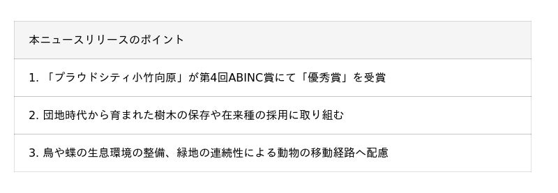 向原第二住宅団地マンション建替組合(理事長:小ノ澤聖二)と、本組合に参加組合員として参画した野村不動産株式会社(本社:東京都港区/代表取締役社長:松尾大作)、旭化成ホームズ株式会社(本社:東京都千代田区/代表取締役社長:大和久裕二)は、本組合が施行した「プラウドシティ小竹向原※1」(所在地:東京都板橋区、以下「本物件」)が、一般社団法人いきもの共生事業推進協議会(以下「ABINC」)が主催する第4回ABINC賞において「優秀賞」を受賞したことをお知らせいたします。なお、それに伴う表彰式が2025年11月28日に開催されました。