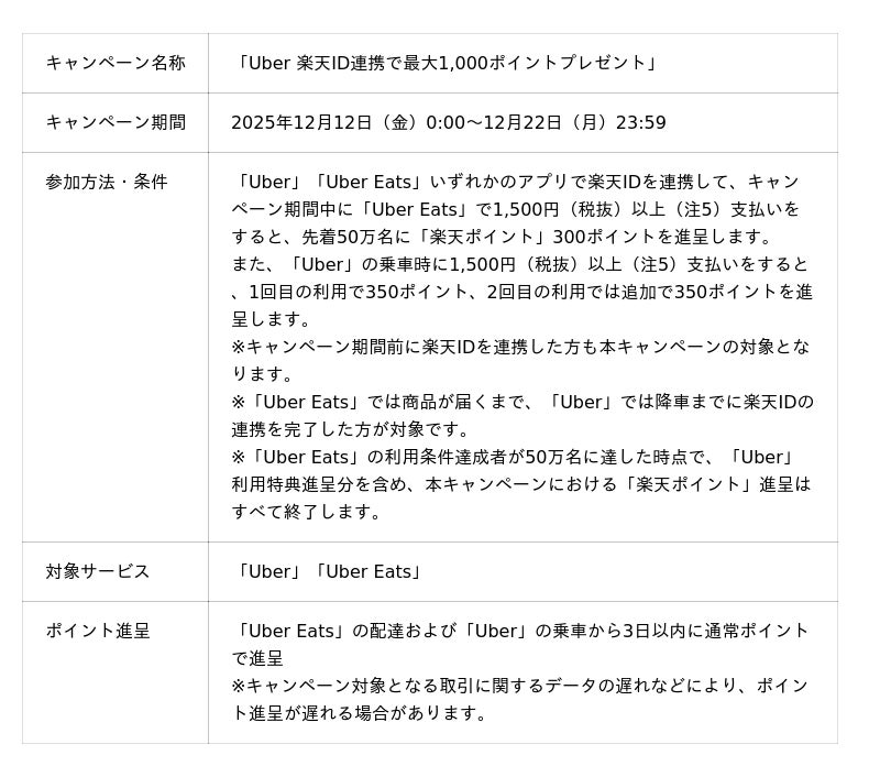 本導入を記念して、2025年12月12日(金)から12月22日(月)まで、「Uber 楽天ID連携で最大1,000ポイントプレゼント」キャンペーンを実施します。
