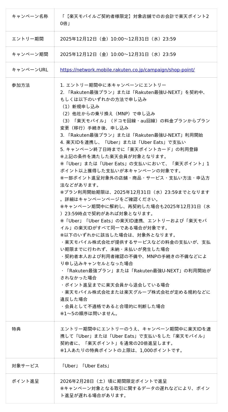 また、現在実施中の「【楽天モバイルご契約者様限定】対象店舗でのお会計で楽天ポイント20倍」キャンペーン(注8)では、2025年12月12日(金)より「Uber」「Uber Eats」が新たに加わります。楽天IDを連携して「Uber」または「Uber Eats」で支払いをした「楽天モバイル」契約者に、「楽天ポイント」を通常の20倍進呈します。