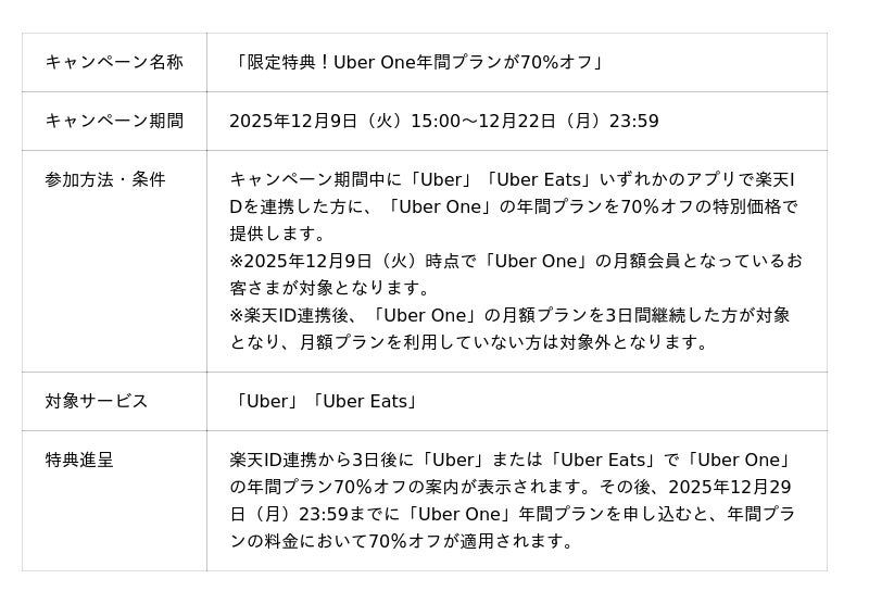 さらに、楽天IDを連携した「Uber One」の月額会員には、年間プラン(3,998円)を70%オフの特別価格で提供します(注9)。