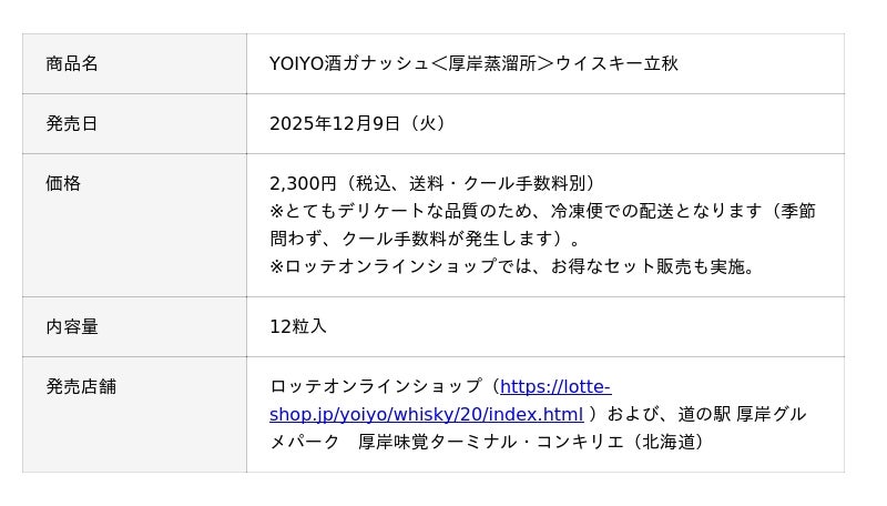 株式会社ロッテ(東京都新宿区、代表取締役社長執行役員:中島英樹、以下ロッテ)は、“日本に酔うチョコレート”をコンセプトとする「YOIYO」シリーズより、堅展実業株式会社(東京都千代田区、代表取締役:樋田恵一)が運営する北海道・厚岸蒸溜所との継続的なコラボレーションから生まれた新機軸の製品「YOIYO酒ガナッシュ<厚岸蒸溜所>ウイスキー立秋」を、2025年12月9日(火)10時より、ロッテグループ公式オンラインモール等にて販売開始いたします。