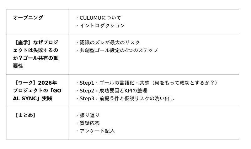 なぜ、多くのプロジェクトがスタート段階でつまずいてしまうのか。数多くの支援を行ってきたCULUMUの経験と、プロジェクト成功に関する調査結果をもとに、チームが同じ方向を向くための「ゴールの合わせ方」を学びます。現場でよく起きる「認識のズレ」の正体を知ることから始めましょう。