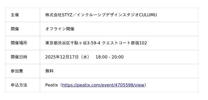 インクルーシブデザインによる事業開発支援を行うデザインスタジオCULUMU(運営:株式会社STYZ、本社:東京都渋谷区、代表取締役:田中辰也、以下「CULUMU」)は、2025年12月17日(水)、プロダクトマネージャー(PdM)や新規事業責任者を対象としたワークショップ『「曖昧なゴールや認識のズレ」による失敗を防ぐ。2026年プロジェクトデザイン実践講座』を、株式会社STYZオフィス(東京都渋谷区)にて開催します。