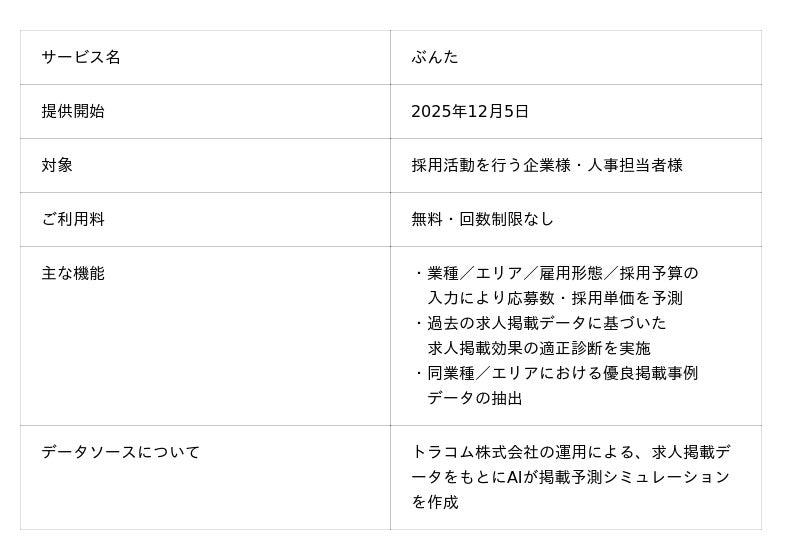 トラコム株式会社(Indeedプラチナムパートナー)は、求人広告の運用データをもとに応募数や採用コストを予測するAIツール『ぶんた』をリリースしました。ぶんたは無料・回数制限なくご利用いただけます。