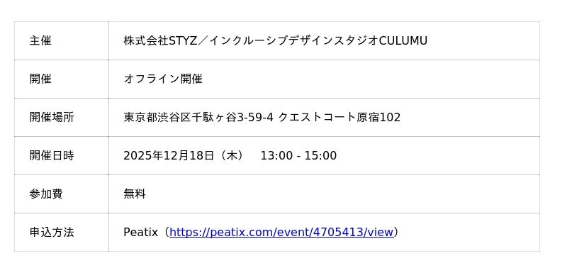 デザインとテクノロジーで社会課題の解決に取り組むインクルーシブデザインスタジオCULUMU(運営:株式会社STYZ、本社:東京都渋谷区、代表取締役:田中辰也、以下「CULUMU」)は、2025年12月18日(木)、AIプロダクトの企画・検証に特化した実践型ワークショップ『ユーザー起点で創る「AIプロダクト」開発ワークショップ ~ 現場の課題を120分で「検証可能なプロトタイプ」へ ~』を株式会社STYZオフィス(東京都渋谷区)にて開催します。
