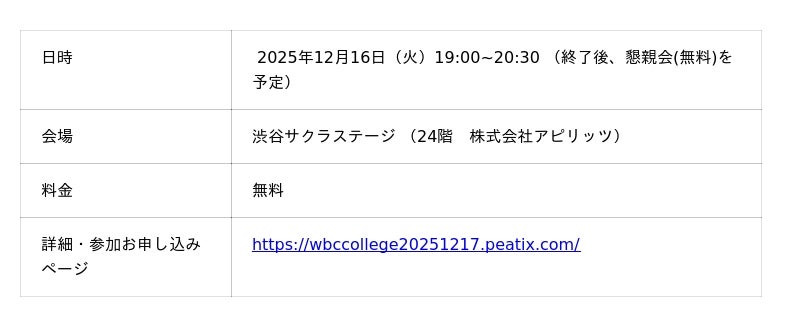 アピリッツ、12/16(火)WBCカレッジ【HCDトレーニングセンター・ウメムラボvol.04】を開催