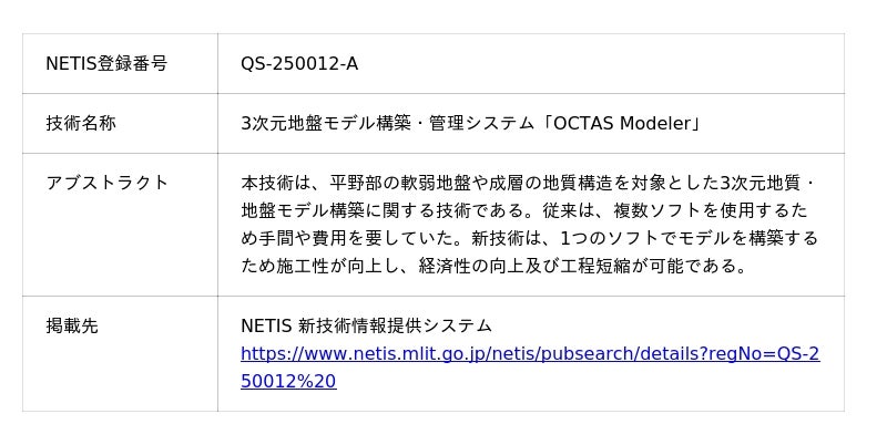 従来は複数のソフトで3次元地質・地盤モデルを構築していたものが、本システムを用いることで1つのソフトでモデルを構築できるため、施工性が向上し、経済性の向上および工程短縮が図られることなどから、2025年11月25日に国土交通省の新技術情報提供システム「NETIS」に登録されました。