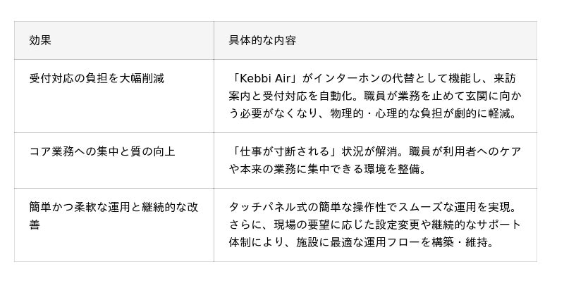 今回の導入により、職員が「業務を中断して玄関まで駆けつけ対応する」という課題が解消されたとともに、来訪時の煩雑な受付業務を自動化できました。これにより、本来のコア業務である利用者へのケアに集中できる環境を実現し、介護現場の業務負担軽減に大きく貢献しました。