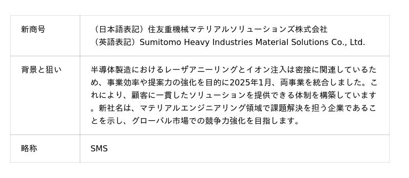 住友重機械工業株式会社(本社:東京都品川区、代表取締役社長:下村真司、以下「当社」)は、半導体事業の強化とグローバルブランドの統一を目的に、以下の2社の商号を2026年1月1日付で変更します。