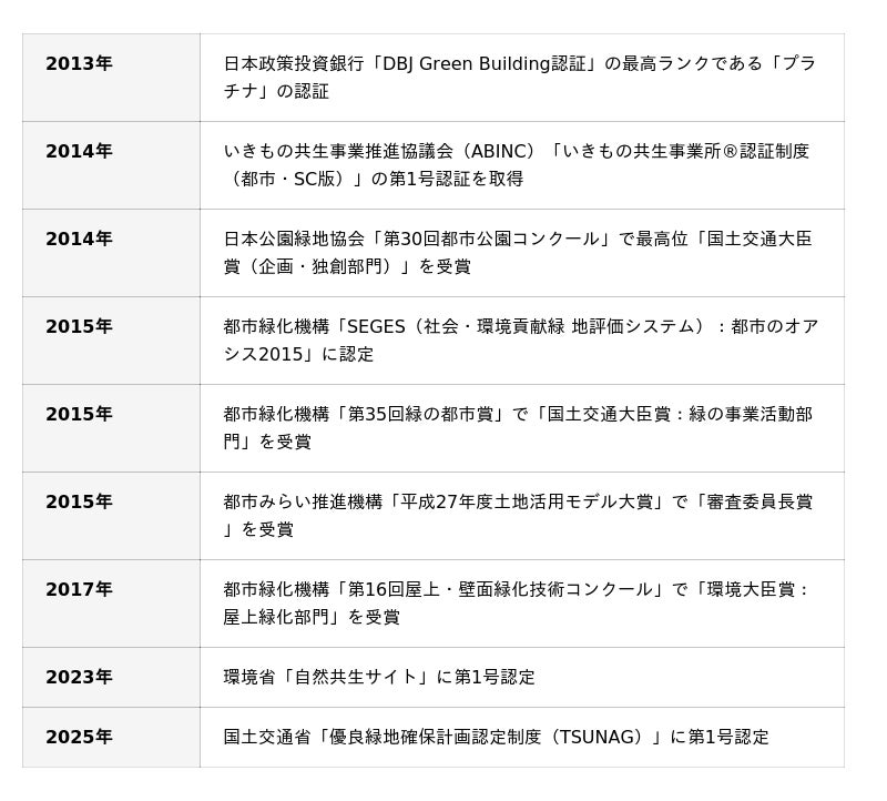 大手町タワー・大手町の森に関する認証・表彰実績例