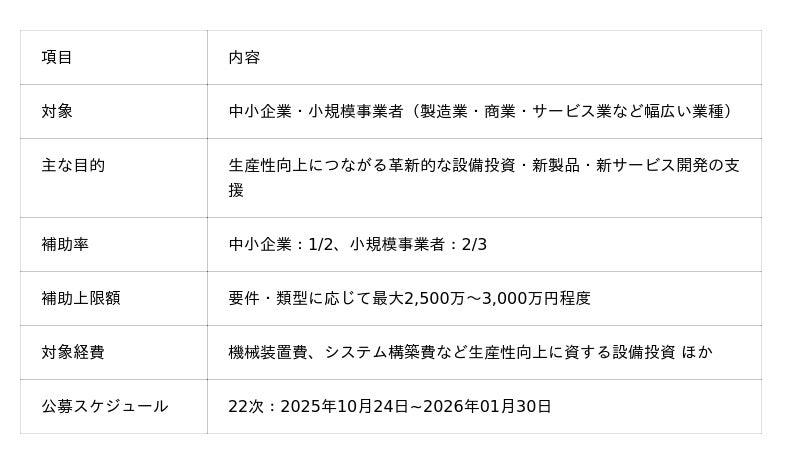 ものづくり補助金は、中小企業・小規模事業者による生産性向上に資する革新的な設備投資や新製品・新サービス開発を支援する国の補助金制度です。製造業に限らず、商業・サービス業も対象で、補助率は中小企業で1/2、小規模事業者で2/3とされており、設備投資負担の大幅な軽減が可能です。